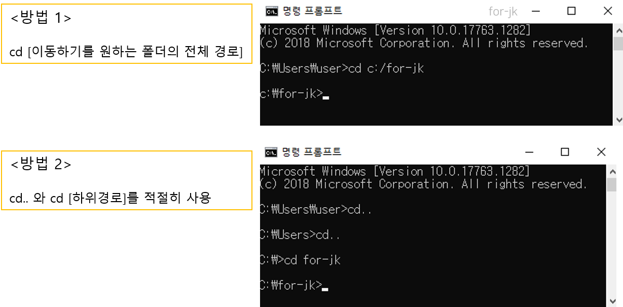 예를 들어, 명령 프롬프트를 처음 켰을 때 나타나는 폴더가 'c:/Users/user'인 경우에 'c:/for-jk'로 이동하기 위해서는 다음과 같은 과정을 거치면 된다.