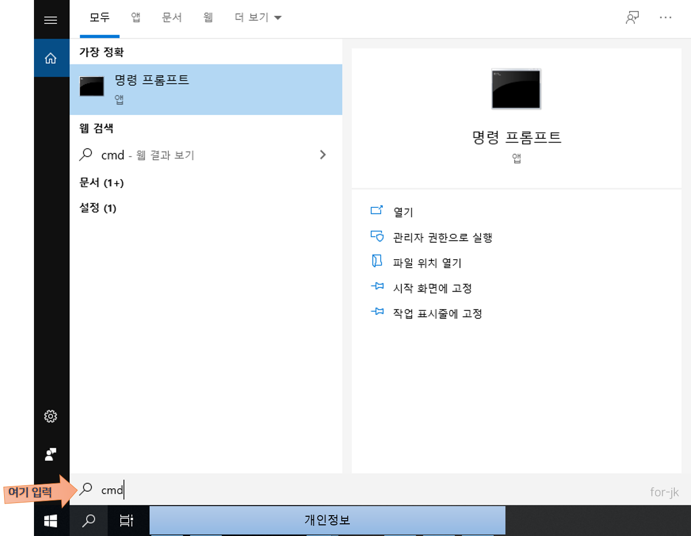: 화면 왼쪽 아래 윈도우즈 아이콘 옆의 돋보기를 클릭 - 나타나는 칸에 "cmd"라고 입력하고 엔터 <그림 4-1 참고>